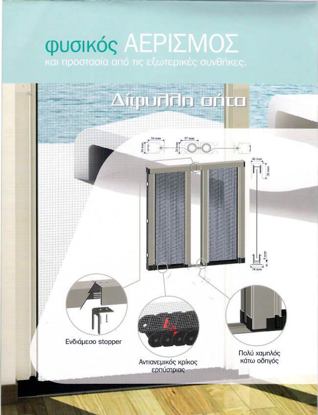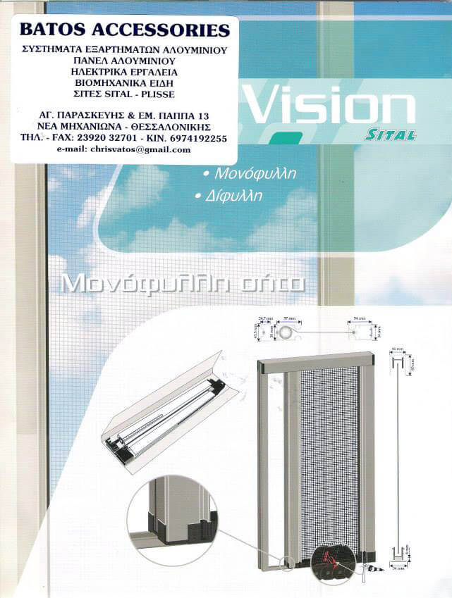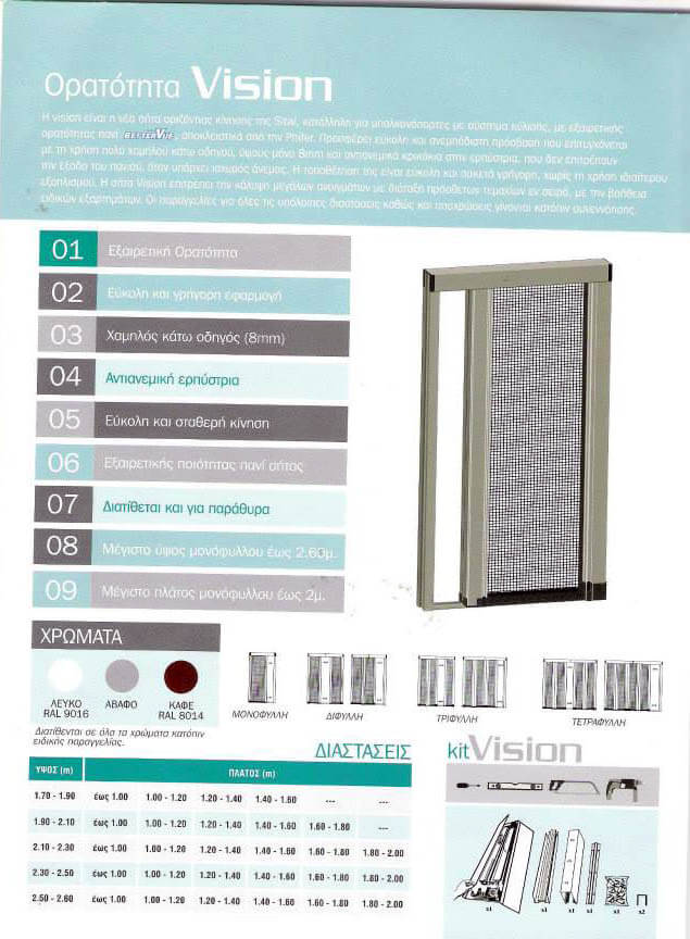 Σίτα οριζόντιας κίνησης κατάλληλη για μπαλκονόπορτες με σύστημα κύλισης. Το πανί της έχει εξαιρετική ορατότητα αποκλειστικά από την Phifer. Η εύκολη και ανεμπόδιστη πρόσβαση επιτυγχάνεται με την χρήση πολύ χαμηλού κάτω οδηγού ύψους μόνο 8mm. Ένα ακόμα χαρακτηριστικό της Vision είναι τα αντιανεμικά κρικάκια της ερπύστριας που δεν επιτρέπουν την έξοδο του πανιού όταν υπάρχει ισχυρός άνεμος.